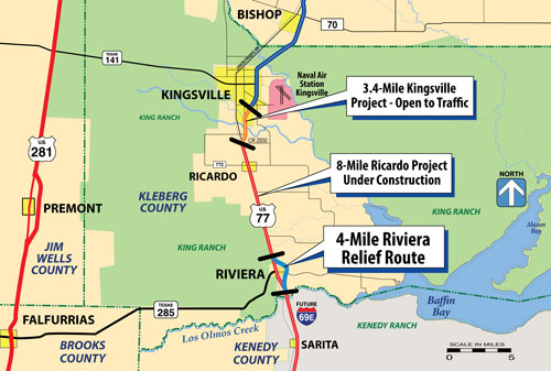 TxDOT has awarded a $178 million contract to build the US 77 Riviera Relief Roue at the southern edge of Kleberg County in South Texas. The four-mile project will create a section of I-69 East that will bypass the last remaining traffic light between Corpus Christi and Brownsville. It is the final piece in the 49.5 miles of I-69E in Nueces and Kleberg Counties running through Corpus Christi, Robstown and Kingsville.